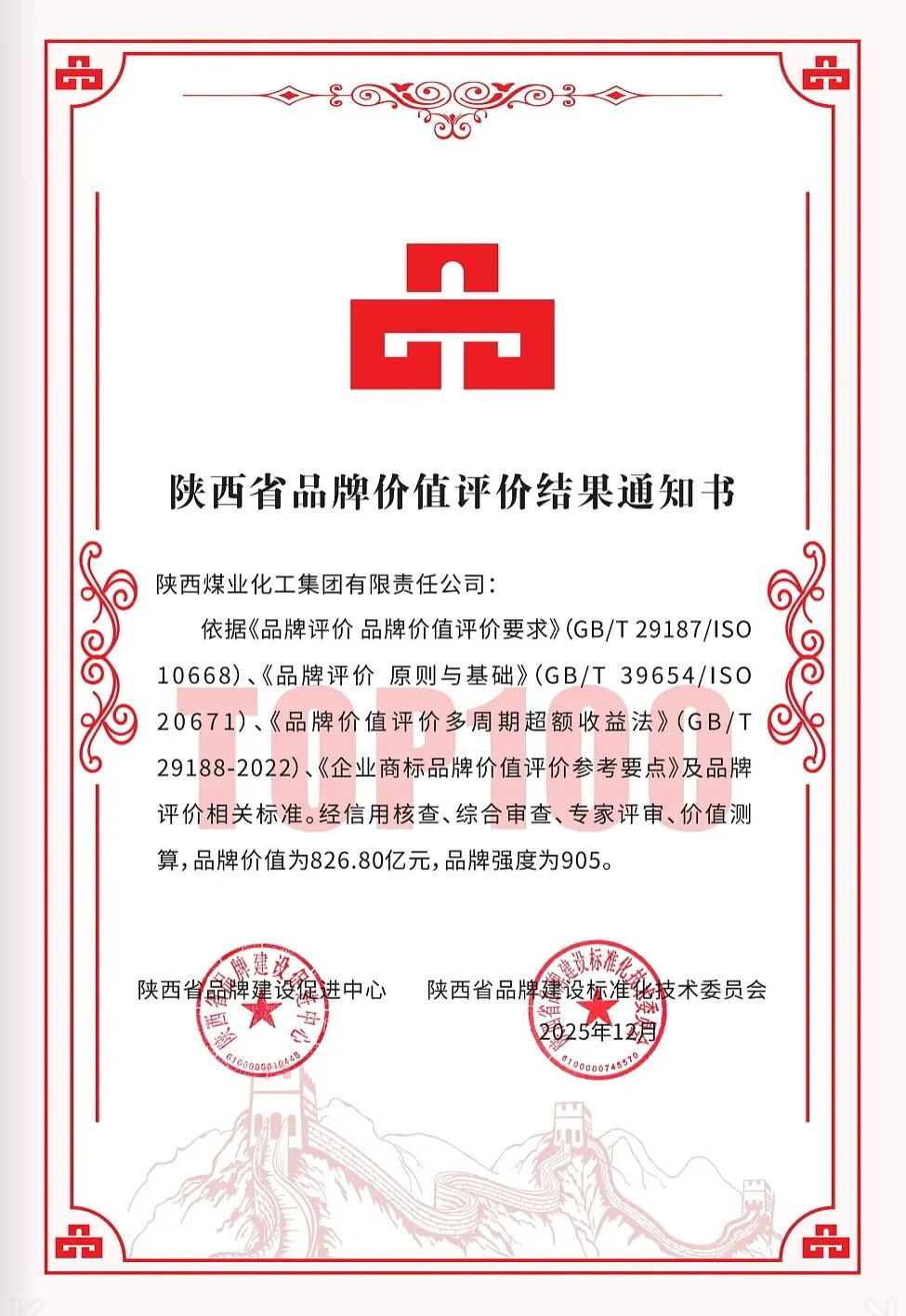 12月26日,2025陜西品牌發展交流大會在西安召開。會上發布了《2025陜西品牌價值TOP100》榜單、2025陜西區域品牌(地理標志產品)品牌價值評價結果、2025年“陜西好商標”評價結果及陜西區域公共品牌助力經濟高質量發展成果案例,陜煤集團以826.8億元的品牌價值位居2025年度陜西品牌價值榜首。