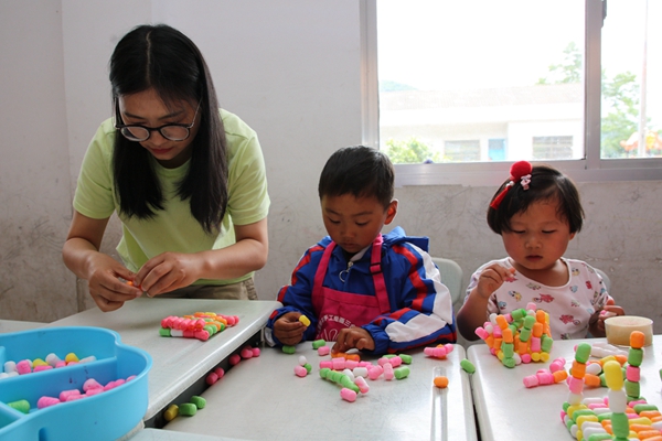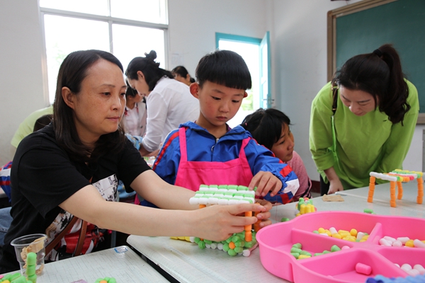 在繪聲繪色的故事講述中,孩子們聽得聚精會神,沉浸在生動有趣的故事中,打開了閱讀之門。在“親子手工課”中,助學人員紛紛化身為“孩子王”,與孩子們零距離交流,手把手陪著孩子創(chuàng)作,整個活動場面熱鬧、溫馨,其樂融融。