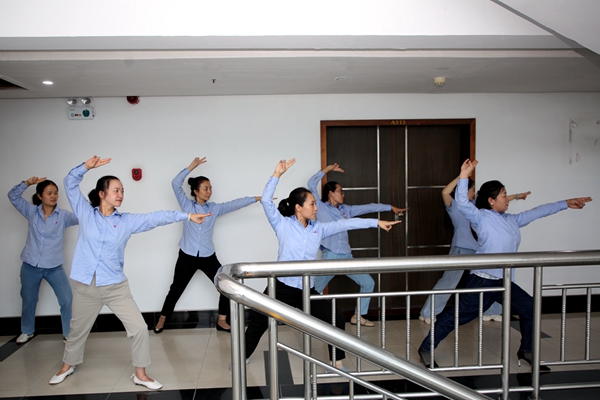 該公司職工利用工作間隙集中教學(xué)練習(xí),大家用心學(xué),認(rèn)真做,力求每個(gè)動(dòng)作規(guī)范到位。“哈哈,這拉弓的姿勢(shì),牛!”“出道了,整套動(dòng)作都get到了!”通過(guò)一遍遍的練習(xí)、糾正,大家的動(dòng)作越來(lái)越順暢、舒展,展現(xiàn)出新的活力與風(fēng)貌。
