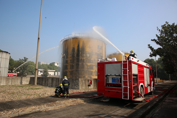 本次演練為貼近實戰的綜合實戰演練,以該公司油庫區2號罐發生火情為背景,分為演練準備、發現火情和火災撲救三個演練階段。演練當日上午10時40分,消防隊接到燃運部報警油庫區2號油罐因外部居民燃放焰火原因導致起火,出動了2輛消防車和兩個戰斗班,立即趕赴現場進行救援。到達現場經火情偵查后,消防隊指揮員迅速做出部署,一輛泡沫消防車對2號油罐北面進行滅火、阻火作業,一輛水罐車對2號油罐南面以及燃燒處噴射滅火,并掩護人員撤離。經過齊心協力的奮戰,火情被成功撲滅,演練取得圓滿成功。